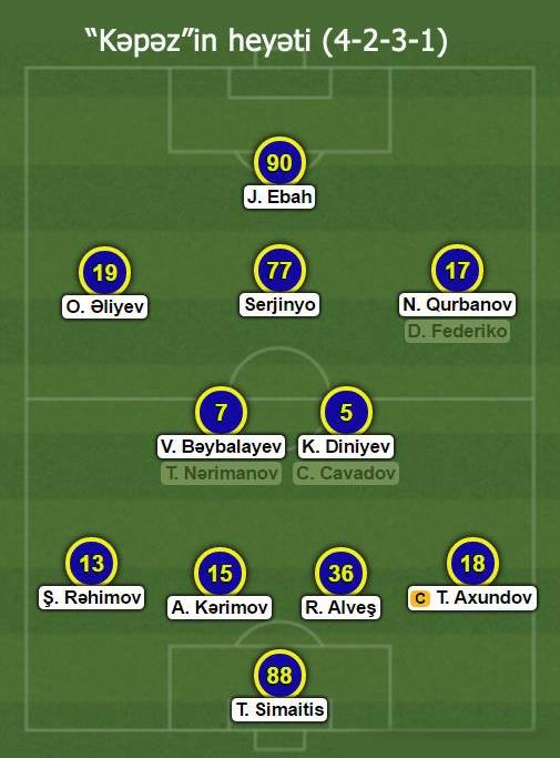 "Kəpəz”in heyətində heç bir dəyişiklik yox idi. Şahin Diniyev eyni futbolçulara və eyni taktiki sxemə güvənmişdi. Üstəlik, zədəsini sağaltmış Dario Federiko ehtiyatda öz şansını gözləyirdi.