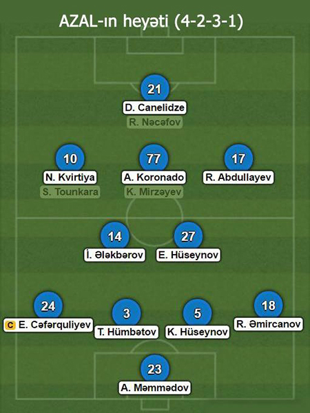 Ənənəvi 4-2-3-1 taktiki sxeminə güvənən Tərlan Əhmədov meydana optimal heyəti buraxmışdı. Üstəlik, yeni transfer Sadio Tounkaranın da adı 18-liyə salınmışdı.