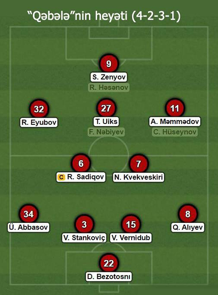 Roman Qriqorçukun son oyunlardakı rotasiyası yenə davam edirdi. Bu dəfə müdafiənin sağ cinahında limitə görə heyətə düşən Qismət Alıyev çıxış edirdi. Hərçənd oyunun gedişində o, bir müddət Ürfan Abbasovla yerini dəyişərək, sol cinaha da keçdi.