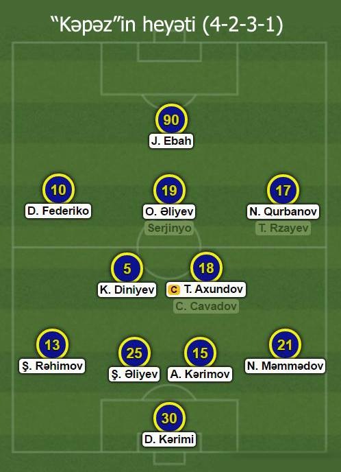 "Kəpəz”də Şahin Diniyev bəzi dəyişikliklərə əl atmışdı. Son 3 oyunda 8 top buraxan Tadas Simaitisin yerinə mövsümdə ilk dəfə Davud Kərimiyə şans verilmişdi. Serjinyo ehtiyatda qalmışdı, müdafiənin mərkəzində isə ilk dəfə Şəhriyar Əliyev-Azad Kərimov tandemi yer almışdı. Bundan başqa kapitan Tural Axundovun yenidən dayaq yarımmüdafiəçisi mövqeyinə çəkilməsi və bununla da mərkəzdə 2 müdafiə planlı futbolçunun çıxış etməsi rəqibin yaradıcı yarımmüdafiə xəttinin qarşısını almaq məqsədi daşıyırdı.