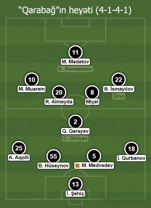 "Qarabağ”da isə Mahir Mədətovun 4 turluq fasilədən sonra start heyətində yer alması və Dinonun ehtiyatda qalması diqqət çəkirdi. Muarem Muarem isə 5 turluq fasilədən sonra yenidən ilk 11-liyə qayıtmış və yarımmüdafiənin solunda qərarlaşmışdı. Belədə qış fasiləsindən sonra bütün matçlarda həmin mövqedə oynamış Ağabala Ramazanov ehtiyatda öz şansını gözləməli idi.