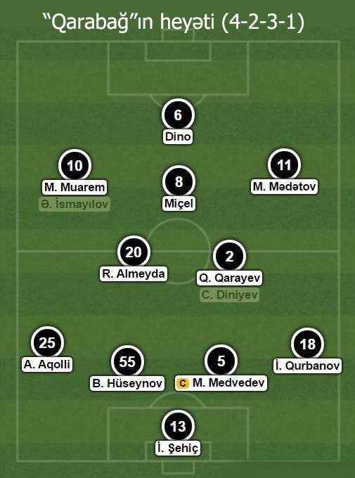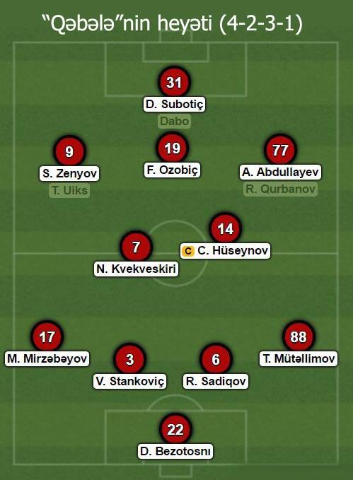Qurban Qurbanov isə meydanın mərkəzini rəqibə uduzmamaq üçün 4-2-3-1 sxeminə üstünlük vermişdi. Üstəlik, Miçel də tez-tez Qara ilə Riçarda kömək etməli olurdu. Əsas dəyişiklik isə hücumun sivri ucunda Dinonun qərarlaşması və bu üzdən Mahir Mədətovun sağ cinahda oynaması ilə bağlı idi. Müdafiə isə son 3 turdakı kimi eyni dördlükdən təşkil olunmuş, Maksim Medvedev kapitan kimi müdafiənin mərkəzində yer almışdı.