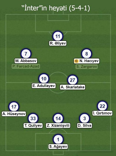 Hər 2 komanda həmişəki taktiki sxemləri və optimala yaxın heyətlə meydana çıxmışdılar. Maraqlıdır ki, həm "İnter”in, həm də "Qəbələ”nin heyətində eyni səbəblə yalnız bir dəyişiklik diqqət çəkirdi. Belə ki, Zaur Svanadze cəzalı Fuad Bayramovun yoxluğunu doldurmaq üçün Adrian Skarlatakeni dayaq yarımmüdafiəçisi mövqeyində oynadırdı.