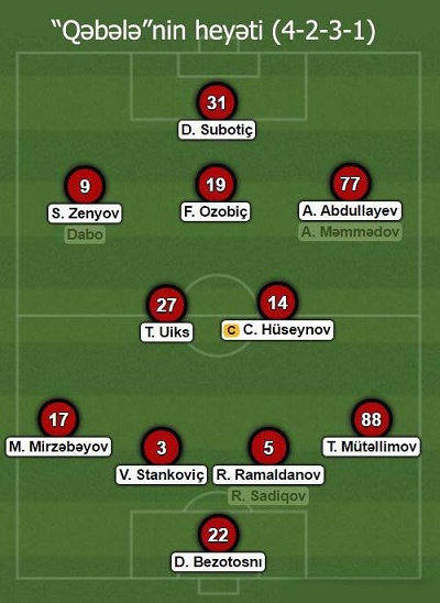"Qəbələ”də isə "Kəpəz”lə görüşdə qırmızı vərəqə almış Nika Kvekveskirinin əvəzinə Teo Uiks ilk 11-liyə salınmışdı. Qeyd edək ki, Uiks sonuncu dəfə 8 tur əvvəl – "Qarabağ”la görüşdə (1:2) start heyətində oynamışdı.