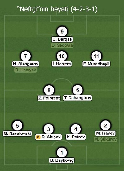 "Neftçi”də yubiley tədbirləri çərçivəsində futbolçuların forma və nömrələri ilə yanaşı, heyətdə də bəzi dəyişikliklər diqqət çəkirdi. Zədəli Pavel Dreksanın yoxluğunda Elxan Abdullayev Jayro və ya Elvin Bədəlova güvənməyərək, kapitan Ruslan Abışovu müdafiənin mərkəzinə çəkmək qərarına gəlmişdi. Belədə yenidən start heyətinə qayıdan Zdenek Folprext dayaq yarımmüdafiəçisi mövqeyində Tərzin Cahangirovla tandem təşkil edirdi. Elxan müəllimin hücumda Seqoviaya yox, Barqasa şans verməsi də maraqlı məqamlardan idi.